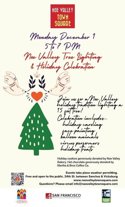 Come bring in the holiday season at Noe Valley's annual tree lighting! Featuring the lighting of our 15-foot tree, caroling, Noe Valley Bakery cookeis, Martha & Bros. hot chocolate, face painting, balloon animals, and an LED acrobatic show!